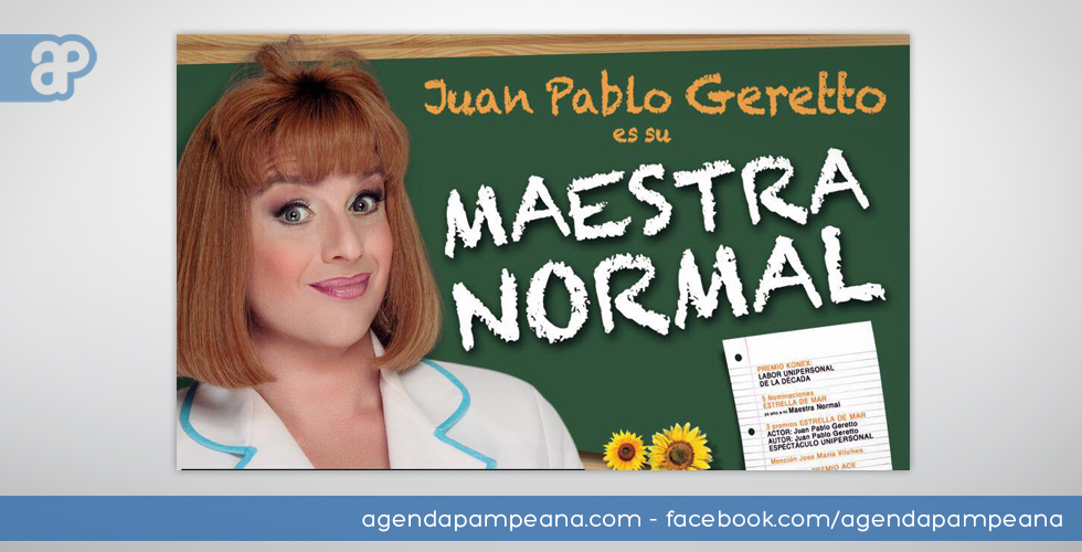 | Juan Pablo Geretto es su maestra normal | Recientemente ganador del premio Martín Fierro al actor revelación por su rol de Reina en la novela Vecinos en guerra , Juan Pablo Geretto interpreta una vez más un unipersonal escrito por él, donde nos invita a recordar una parte de nuestras vidas: la etapa de nuestra educación y su símbolo, la maestra. |